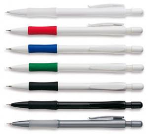 Smal blyertspenna med vit kropp och färgat eller transparent gummigrepp. Finns även som helsvart eller silver. Det finns möjlighet att beställa pennorna i egna PMS- färger vid order om minst 20000st.