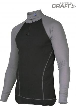 Funktionsundertröja med polo. Sluter tätt mot kroppen. Kort dragkedja fram med zipguard, som skyddar hakan mot skav. Raglanärm. Förlängd bak. Ingen söm i sidan för att undvika skav och irritation. Mudd i avslut av ärm. Tvåfärgad med flatlocksömmar i avvikande färg.